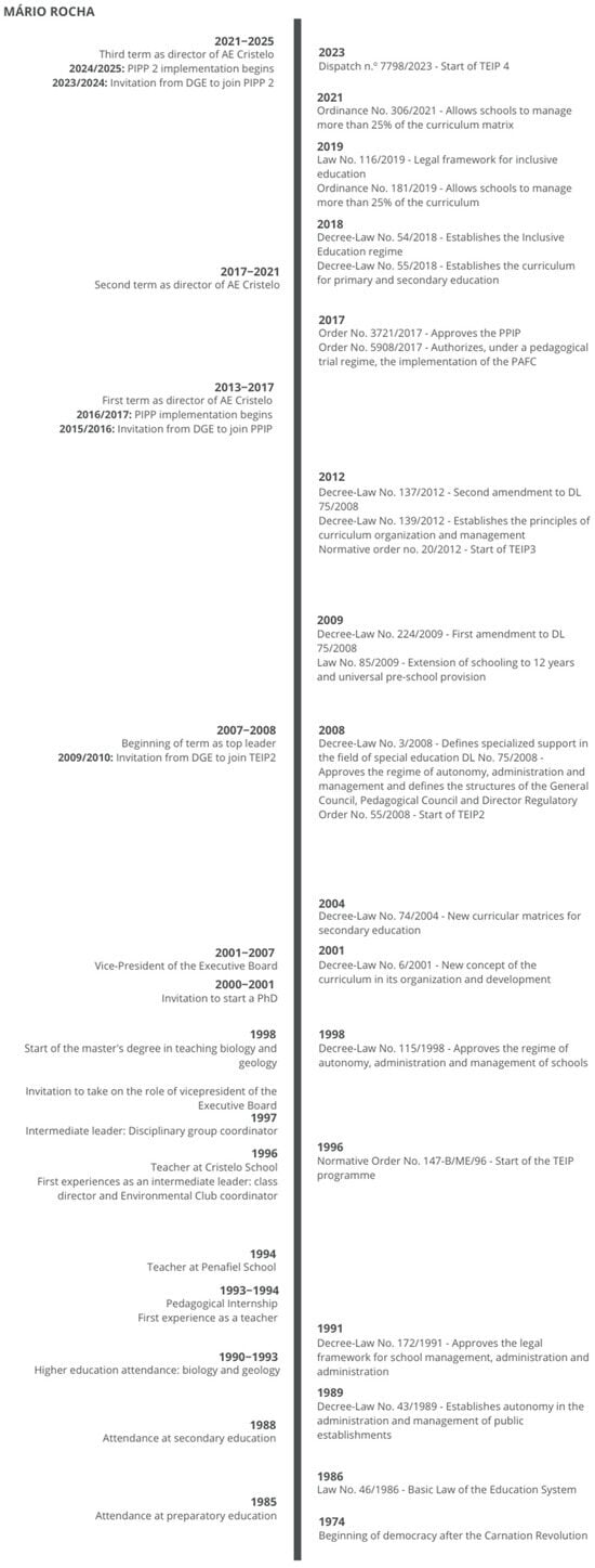 We begin by presenting the chronotopography of principal Mário Rocha of the School Cluster of Cristelo (Figure 1). Having arrived at the school in 1996, he began to take on middle leadership roles from an early age, namely as class principal, coordinator of the Environment Club and coordinator of the subject group. Two years later, he was invited to join the school’s Executive Board as vice president, and it was at this time that he began his master’s degree in teaching. After completing it, he was invited to carry out his PhD in 2001. As vice president until 2007, he broke with the current board and took on the role of top leader in 2007/2008, which he has held to this day, and after two years he joined the TEIP programme. In 2015/2016, he was invited by the Ministry of Education to join the PPIP and in 2023/2024 the PPIP2.