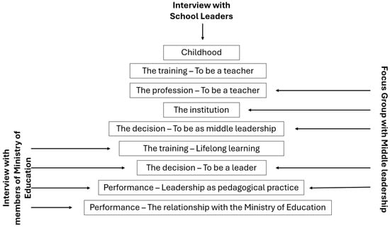 - First interview: chronological exploration of the career, transcribed and subjected to analysis, present in the attached script through the parts of childhood; training—in teaching, the profession, the institution; the decision—to be a middle leader; training—in school administration; the decision—to be a principal; the performance—leadership as pedagogical practice and the relationship with guardianship;
