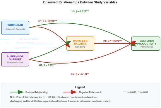 First, our structural equation modeling analysis revealed that all five hypothesized relationships were statistically significant, though three relationships manifested in directions contrary to our initial hypotheses. Specifically, we found that workload negatively impacts work–life balance (C.R. = −5.095) yet positively influences lecturer productivity (C.R. = 3.567). Supervisor support demonstrated a positive effect on work–life balance (C.R. = 7.961) but, unexpectedly, a negative impact on lecturer productivity (C.R. = −3.213). Perhaps most surprisingly, work–life balance exhibited a negative relationship with lecturer productivity (C.R. = −4.069), challenging conventional wisdom about the benefits of balanced work arrangements.