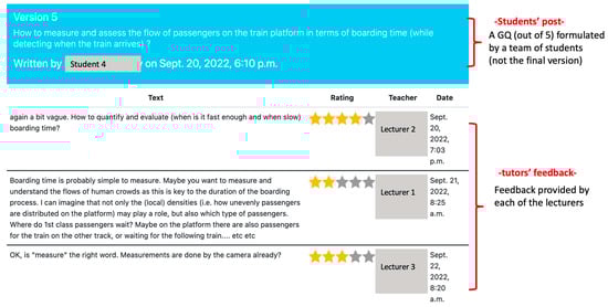 This GQ had six previous versions. In the second version, “What are the rules and guidelines for designing a train station that need to be kept in mind while modifying it?”, the students received the following input by one of the lecturers: “Maybe a bit more general. What is already known about the dynamics of human crowds during boarding and how is this currently taken care of in stations design?”