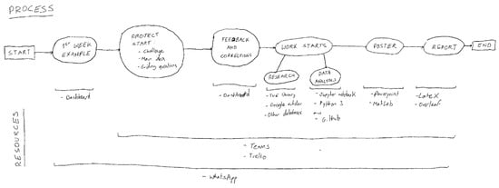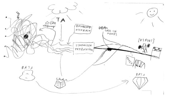 In relation to how the students structured and developed their activity, Team 1 indicated in their report that they learned “that we have to watch out for assumptions that might not be true. On the other hand, we also learned that it is good to keep reflecting on the progress of the project and to not be afraid to change things if necessary.” For this, the use of the Dashboard played a central role in supporting the reflection of the Guiding Questions. This can be observed in the drawing made by one of the students during the interview (Figure 3).
