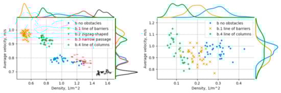 The graphs in Figure 4, show how Team 1 determined that “when something is placed in between the two flows, the efficiency is much higher” and that “a line of columns works best”. They did this by relating the density of people per square meter to the average speed of those people depending on the obstacles they encountered.