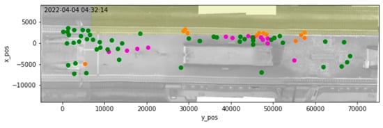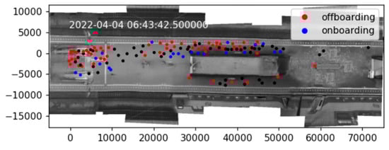 Figure 9 represents a frame of an animation showing people getting off the train (purple dots) and those boarding the train (orange dots). The green dots are people without determining whether they are boarding or exiting the train.