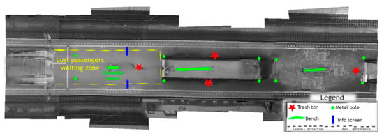 To answer this question, the students identified on the map of a train platform (Figure 10) places that attract (benches, timetables) and deter passengers (trash bins). The students observed that people tend to lean on the black, metal poles, hence these places were also included in the map.