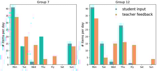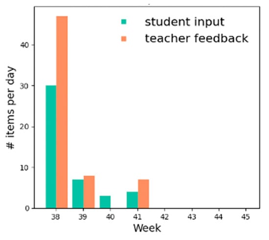 In addition, the Dashboard allowed students and teachers to interact outside of lectures; about 30% of the content posted by both teams was outside of lectures hours (33% Team 1, 21% Team 2), and teachers provided 50% of the feedback outside lecture hours (Figure 12).