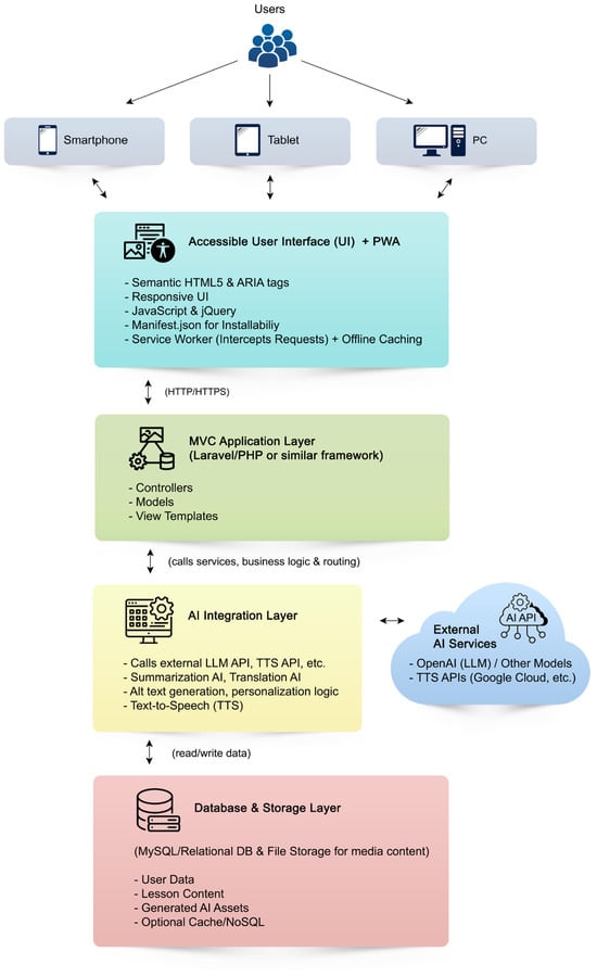 From a technical point of view, the AccessiLearnAI platform is developed using a layered architecture, which separates responsibilities into separate components (Stelea et al., 2025b): a responsive front-end user interface (with offline PWA support), a back-end application layer built on an MVC (Model–View–Controller) web framework, an AI integration layer (connecting to external AI services), and a data storage layer (relational database with caching), as shown in Figure 1.