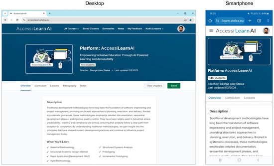 Unlike native apps, PWAs rely on offline caching mechanisms, push notifications, and near-instant installability across multiple platforms, factors that e-learning systems can significantly benefit from (Nugraha et al., 2022). This type of approach is favorable for learners with low bandwidth or who are located in rural areas, allowing them to store AI-generated lessons and course sections (such as summaries or TTS files) offline. After the device reconnects to the Internet, the automatic synchronization mechanism manages updated content, such as new or revised alternative text or extended teacher notes. This type of design helps to achieve more inclusive, robust, and device-independent solutions for large-scale deployment (Huber et al., 2021).