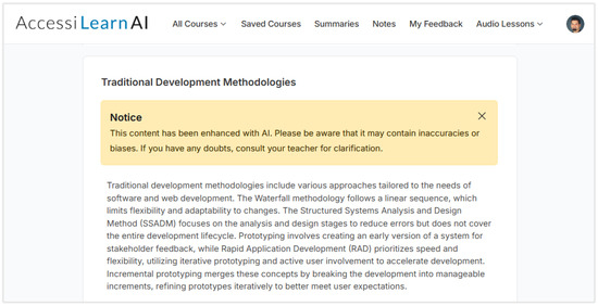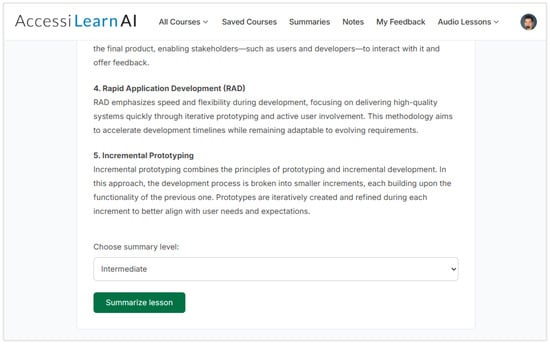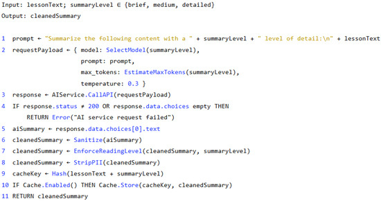In order to use a large language model (LLM) (Yao et al., 2024) from the Generative Pre-Training Transformer (GPT) (Yenduri et al., 2024) series, we integrated the OpenAI API (OpenAI, 2025) for NLP tasks. Compatibility with other models was also foreseen in the design, to generate summaries from text, simplify text to a specified level, or produce alternative text for images. For example, when a teacher uploads a document with a lesson or course, the AI integration layer handles the raw text and sends instructions to LLM such as “Analyze the following lesson text and identify key sections, then suggest appropriate HTML5 structural tags and ARIA roles for each section.” The AI-generated response is provided in JavaScript Object Notation (JSON) format, defining the placement of headings, sections and accessibility markups, which the platform embeds into the content for the teacher to approve. Similarly, for student requests, when a student clicks “Summarize” the integration layer sends an instruction such as “Summarize the following content in a concise, student-friendly manner (approximately 200 words): [lesson text].” Figure 3 presents the structured algorithm used by the system to request and process AI-generated summaries, based on the input lesson content and the specified summary level. It outlines the construction of the prompt, the invocation of the AI service, response validation, post-processing steps, and optional caching for efficiency.