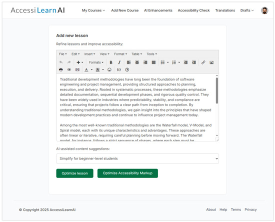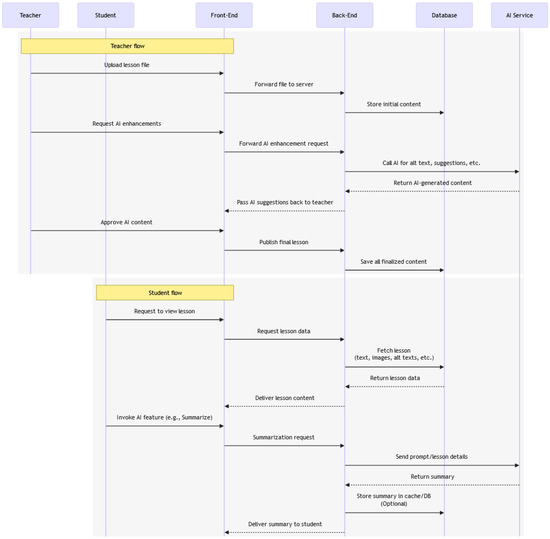 The AI integration layer plays a central role in providing dynamic personalization. For example, students can request summaries tailored to different reading levels or have complex paragraphs simplified. Image uploads are scanned and matched with context-aware, AI-generated alt text. In multilingual environments (Kirss et al., 2021), AI-based translation services allow students to consume materials in their preferred language. All AI interactions are designed to be transparent, with fallback mechanisms and manual override options to maintain pedagogical control.