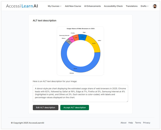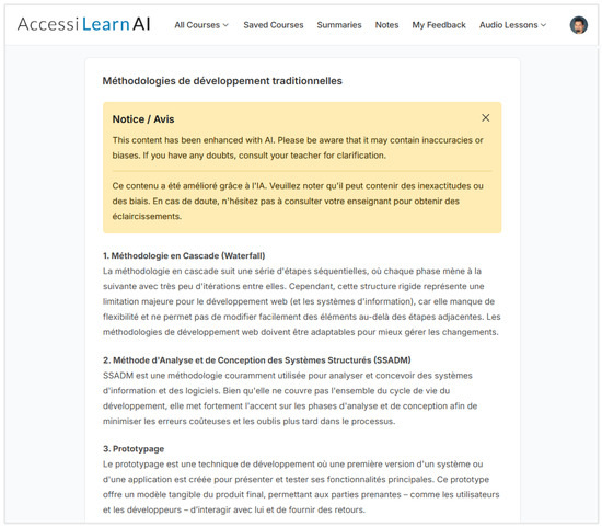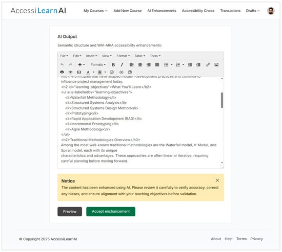 If AI results are delayed or unavailable, the system retries or shows a fallback message. Critical content (e.g., alt text) always undergoes human review to ensure quality. This human-in-the-loop (Mosqueira-Rey et al., 2023) checkpoint ensures that AI suggestions enhance content but do not degrade it with errors or biases.