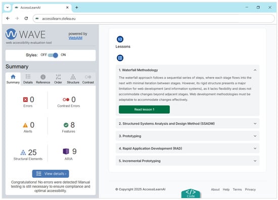- WebAIM. (2025). WAVE web accessibility evaluation tool. Available online: https://wave.webaim.org/ (accessed on 20 February 2025).