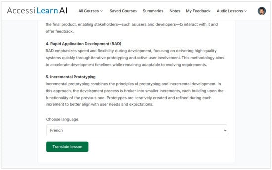 Translation: Neural machine translation (NMT) can be used to convert entire lessons or just sub-sections of a lesson in real time, although technical language specific to certain domains or languages with fewer resources still present challenges (Klimova et al., 2023). The synergy of translations using LLM with teacher supervision can address inaccuracies or domain jargon.