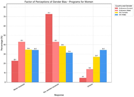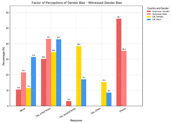 To answer RQ2 (‘How do perceptions of gender bias in the technology field differ between respondents in the UK and Indonesia?’) and test H2 (‘Women will report higher perceptions of gender bias than men in both contexts’), the analysis focused on perceptions of gender bias in the technology field, comparing responses from individuals in the UK and Indonesia. Five key factors were examined: witnessed gender bias, programs for women, promotion to leadership, difficulty in tech careers, and tech stereotypes.