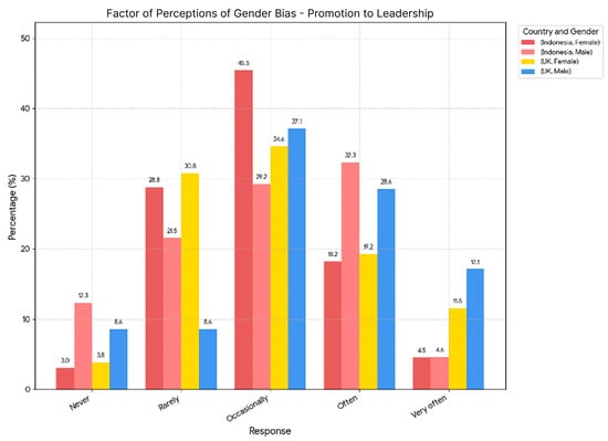 In contrast, UK female respondents expressed an even stronger perception of difficulties. A total of 34.6% reported that they ‘Strongly agree’ and another 34.6% that they ‘Agree’ with the statement. A smaller percentage were ‘Neutral’ (11.5%) or reported that they ‘Disagree’ (19.2%), with 0.0% reporting that they ‘Strongly disagree’. The perception of challenges was notably lower among male respondents in both countries. For Indonesian males, 32.3% ‘Disagree’ and 3.1% ‘Strongly disagree’ that women face more difficulties. Conversely, only 7.7% ‘Strongly agree’ and 13.8% ‘Agree’, while the largest group (43.1%) remained ‘Neutral’. Similarly, UK male respondents also showed lower agreement levels. A total of 31.4% ‘Disagree’ and 2.9% ‘Strongly disagree’ that women face greater difficulties. While 5.7% ‘Strongly agree’ and 25.7% ‘Agree’, a significant portion (34.3%) were ‘Neutral’.