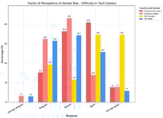 These findings highlight a clear disparity in perceptions between genders. Women in both countries, particularly in the UK, perceive greater structural barriers to entry and advancement in technology careers than their male counterparts acknowledge. A substantial combined 48.5% of Indonesian females and an even more pronounced 69.2% of UK females either agree or strongly agree that women face more difficulties.