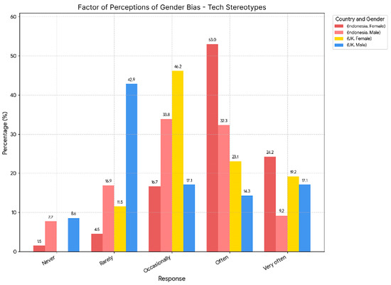 These findings suggest that cultural attitudes may play a key role in shaping the prevalence and perception of gender stereotypes in technology. The significantly higher reporting of frequently encountered stereotypes (‘Often’ or ‘Very often’) among Indonesian respondents (Indonesian females: 77.2%; Indonesian males: 41.5%) compared to UK respondents (UK females: 42.3%; UK males: 31.4%) highlights a more pronounced issue of stereotyping in the Indonesian context as perceived by the participants.