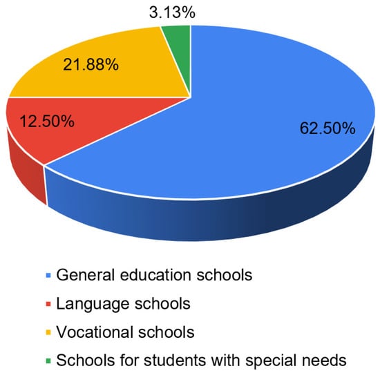 Figure 1 presents a pie chart of the answers to the question “What type of school do you teach at?”. Fourteen of the respondents reported teaching in schools for general education, while the rest answered that they taught in profiled schools: three in language schools, four in vocational schools, and one in profiled schools for students with special needs (namely, for children with hearing impairments).