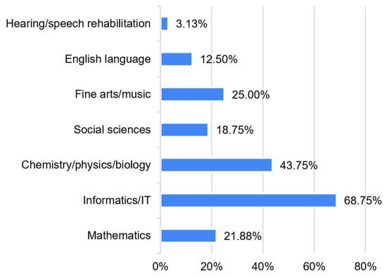 The position a teacher currently holds at the school represents an important characteristic of the participant profile. Fourteen of the participants appear to work as teachers, fifteen as senior teachers, and two as deputy directors or heads of the department. Next, the participants reported teaching various subjects, as shown in Figure 2. About 60% of teachers reported teaching more than one subject. The shares of subjects taught at schools are presented in Figure 3, where mathematics and informatics form circa 80% of the answers, while chemistry, physics, and biology have a share of about 44%. These subjects were taught at different grade levels, as presented in Figure 3. The sum of all the numbers is greater than 100%, because many teachers reported teaching at more than one grade level (most frequently at the next grade level).