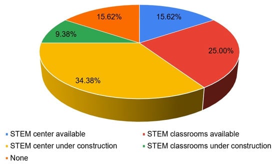 The authors started the thematic part of the survey with questions about the availability of STEM centers (classrooms) in the school where the teacher teaches. Figure 4 depicts a pie chart of the results. Only 5 teachers reported having a STEM center (more than one classroom) built at their school, while eleven participants shared that such a center is under construction. Eight other teachers reported having a STEM classroom, while five teachers answered that they had neither a STEM center nor a classroom. Therefore, about 84% of the interviewed teachers reported having no STEM center at their schools. As a consequence, 5/8 of the interviewed answered they do not have a STEM center or classroom at their school, while only ¼ shared that they use it every day. Teachers who have no STEM center available said that their daily training is conducted in the specialized classrooms at their school.