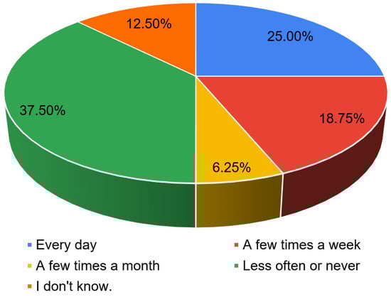 Next, teachers were asked how often their STEM centers or classrooms are used by other teachers. Figure 5 provides a pie chart diagram of the results. When the STEM center is completed, specialized training and laboratory classes in STEM subjects will be conducted there according to a weekly schedule. Work in extracurricular activities is also conducted according to a weekly schedule in STEM classrooms and, if available, in multifunctional STEM centers. The profile of teachers who use the STEM center (classroom) at their school, in terms of subjects taught, appeared to be similar to that presented in Figure 2. At the same time, three teachers shared that they use a STEM center or classroom at another school, and another seven stated that they would use it if they had access to it. Furthermore, they explained that the majority of their colleagues (independent of their experience) desire to use such STEM centers or classrooms, if available at their school, such as STEAME teachers in science, mathematics, entrepreneurship, technology, and art, as well as elementary teachers in their work in mandatory and elective STEM subjects and extracurricular activities.