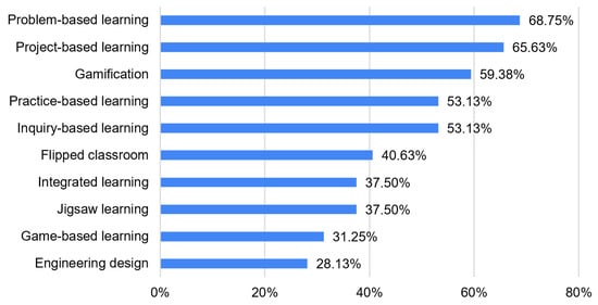 The main goal of the interview was to reveal the level of usage of contemporary teaching methods in STEM education. Figure 6 summarizes the shares of respondents who reported usage of specific methods while teaching STEM subjects. The interviewees opted for multiple-choice methods; thus, about two-thirds of them explained that they apply problem-based and project-based learning, while less than one-third shared that they use game-based learning and engineering design when teaching STEM. Unexpectedly, the number of teachers using gamification were about twice as frequent as those applying game-based learning. At the same time, teachers reported using other methods such as STEAM days and science weeks; teamwork (with each student in the team being assigned a role and tasks to complete) and interdisciplinary projects that are carried out in different subjects; furniture modeling; speech and subject activity (speech is developed through modeling or musical stimulation or through rhythmic physical training); and project work with colleagues from other countries.