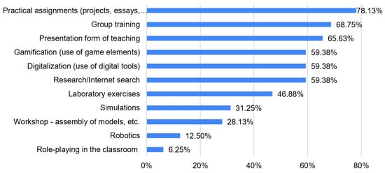 Next, teachers were asked about using various teaching techniques and tools in their STEM courses, as presented in Figure 7. They shared that they use gamification at the same level as digital tools and Internet searches. Approximately four-fifths of them reported using practical assignments, such as projects, essays, and tasks, and two-thirds stated that they apply group training and presentation forms of teaching. On the other hand, simulations and workshops were used by fewer than 1/3 of the interviewees, while robotics and role-playing were used by 1/8 and 1/15 of them, respectively.