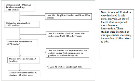 Figure 1 illustrates the process employed to document the number of studies reviewed and ultimately included in the meta-analysis of the effects of professional development programs on students’ achievement. Initially, there were 3018 potential studies considered for inclusion in this study. Following the critical synthesis of the professional development literature, 30 out of 76 (39.5%) studies were identified as implementing an experimental or quasi-experimental design and having sufficient data to examine the effects of interventions on student achievement. Although a total of 30 studies included intervention math scores, 24 studies reported on more than one intervention, thus considered as having multiple studies, resulting in an increased number of effect sizes to 164 (see Table 1). Table 1 provides an overview of the studies meeting the inclusion criteria for this meta-analysis study.
