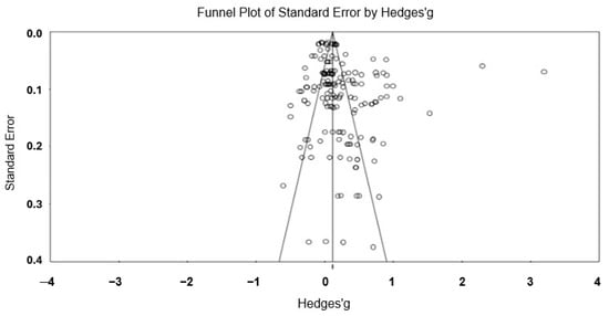 First, a funnel plot was generated, plotting the standardized difference in means (x-axis) against the standard error (y-axis) (refer to Figure 2). The funnel plot indicated no apparent publication bias, with studies evenly distributed on both sides of the average random effect size. In the presence of bias, the distribution would be asymmetrical, with a concentration of studies on one side of the average, indicating potential missing studies.
