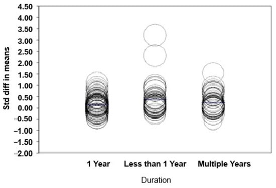 The R2 analog is 0.00, indicating that 0% of the variance in true effects can be explained by the difference between subgroups. The absolute effect size for PD lasting one academic year is 0.1344, while for short-term PD (one-time or less than 1 year), it is 0.1344 + 0.2167, totaling 0.3511 (refer to Table 3 and Figure 3).