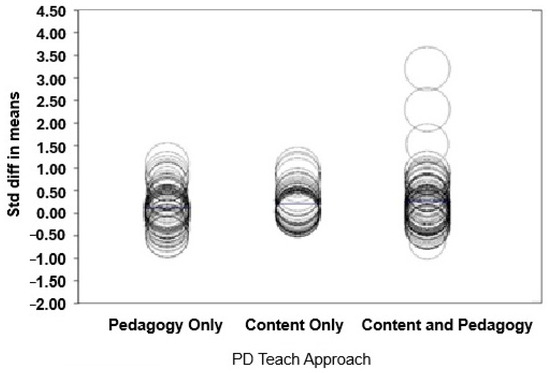 Among the various professional development teaching approaches analyzed, only the content and pedagogy category showed significance. This suggests that the effect size is likely higher in studies involving content and pedagogy PD in students’ math achievement scores compared to studies involving pedagogy-only PD.