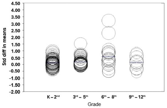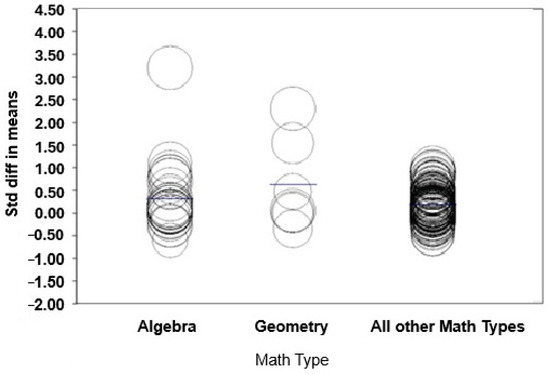Table 3 presents the outcomes of the meta-regression analysis for these moderators: duration of the program (less than 1 year, 1 year versus multiple years); professional development teaching approach (content only, pedagogy only, content and pedagogy); modality of the PD program (workshop only, workshop plus coaching, workshop plus other support); students’ grade level (K—2nd, 3rd–5th, 6th–8th, and 9th–12th); type of math content taught in the PD program (geometry, algebra, and all other types of mathematics); professional development category [professional learning community, formative assessment, curriculum, online PD, reformed initiated math, combined types of PD, cooperative learning, and technology (calculator, computer software) PD]; and study design (randomized and non-randomized).