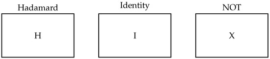 As an example, the effect of the Hadamard gate on a qubit, for example, to both |0⟩ and |1⟩, lead it to superposition, i.e., to have a probability of 0.5 for occurrence after measuring 0 and also 0.5 for measuring 1 (Equation (4)).