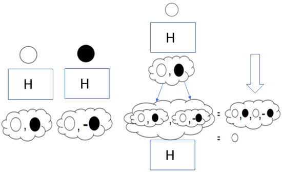 Finally, the explanation of the Hadamard double gate application was given that when a white ball enters the result is a white or black ball with equal probability of occurrence but when a black ball enters the result is again a white but minus black ball again with equal probability. Thus, if white ball is entered in box H has not yet decided the result but it will be either white or black ball. If it is a white ball the second box will return either white or black whereas if it was black it would return either white or minus black. Therefore, the black balls cancel each other out and the probability remains that it is a white ball or white again, i.e., 100% white (Figure 3). A similar result is obtained if the first box returns a black ball where in the end the result will be black again.