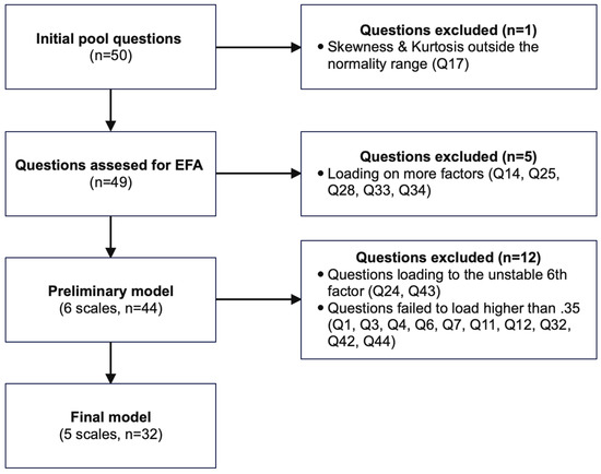 | Q6. I would rather find out about things by asking an expert than by doing an experiment (−) | 0.340 | 0.154 | −0.084 | 0.082 | −0.013 | −0.164 | Loading < 0.35 |