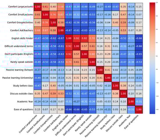 Additionally, we found that active study habits, such as the frequency of pre-class preparation and peer discussion, were positively correlated with overall participation comfort (r = 0.33–0.39, p < 0.001) but had essentially no correlation with language anxiety (correlations near zero). This reinforces the idea that, while preparation and peer support help boost students’ confidence to participate, these actions by themselves do not directly reduce the language difficulties students experience; instead, they help students cope despite those difficulties. Finally, we observed that a student’s year of study had minor effects on these variables; being a more senior student (closer to graduation) was associated with a modest decrease in language anxiety (r = −0.14, p = 0.005) and a slight increase in overall participation comfort (r = 0.14, p = 0.005). These weak correlations align with the earlier observation of a gradual adjustment over time, with later-year students feeling somewhat more at ease, although this change is not substantial. We also noted that students who reported that the survey was easy to understand, which we used as a rough proxy for English comprehension ability, tended to have lower overall language anxiety (r = −0.22, p < 0.001).