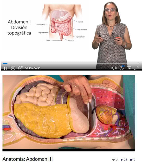 Seventeen educational pills were created, with durations ranging from 8 to 15 min, designed to reinforce topics covered in class, such as the morphology of body systems, functional anatomy concepts, and the relationship between anatomical structures and major diseases, key aspects of nursing degree training. The video format was predominantly visual, utilizing 3D models and anatomical atlas images, with identified sources, explanatory narration developed by the course instructor, and on-screen text to enhance the understanding of concepts (see Figure 2).