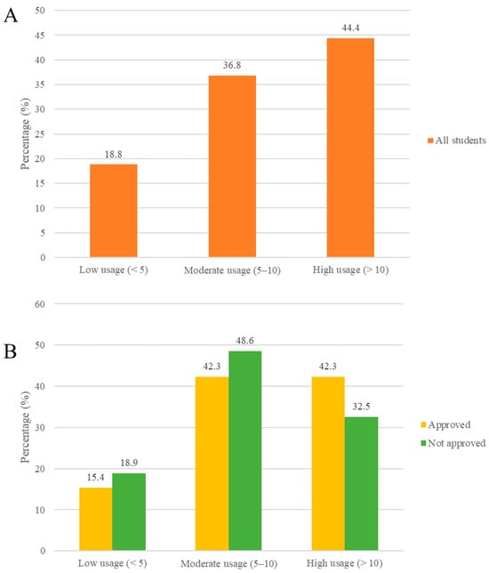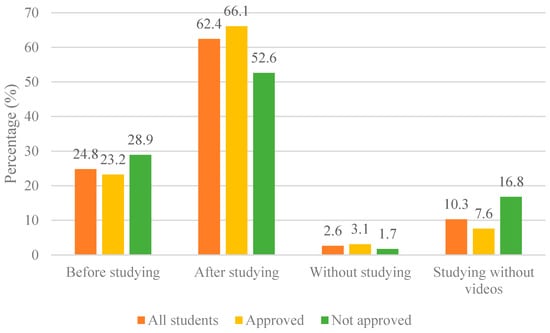 The analysis of video usage and the timing of viewing in relation to the results of the first exam is shown in Figure 4A,B and Figure 5. To assess how the resource was used in relation to the first exam outcome, a chi-square test of independence was conducted. The results showed no statistically significant difference between video usage (low, moderate, high) and academic performance (approved or not approved) on the first exam.