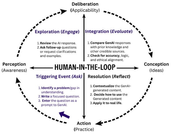 In sum, cognitive presence (in the PI model) offers a structured way to define and measure critical thinking in online GenAI-mediated learning. By tracing students’ prompts, reflections, and chat responses through the four phases and two axes, we can characterize their role as a human in-the-loop. Accordingly, we can shed light on whether students are merely passively reading AI output and adopting it, or whether they are generating follow-up questions, critiquing the AI, and iteratively refining their understanding until they contextualize and practically refine the generated outcome to be applied in their learning situations.