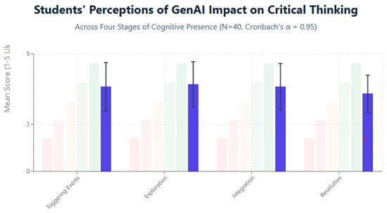 Upon examining the survey data, which demonstrated strong internal reliability (Cronbach’s alpha = 0.95), students agreed that GenAI could enhance their critical thinking, endorsing 8 out of the 12 statements, with the strongest agreement appearing in the exploration and integration phases of the cognitive presence framework.