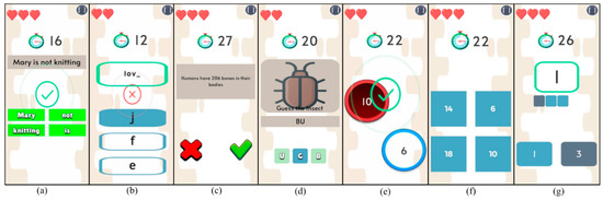 The screenshots of EduGym gameplay: (a) Scramble, (b) Fill Me, (c) Guess Me, (d) Who Am I, (e) Pop One, (f) Order Up, and (g) Zero Quest.