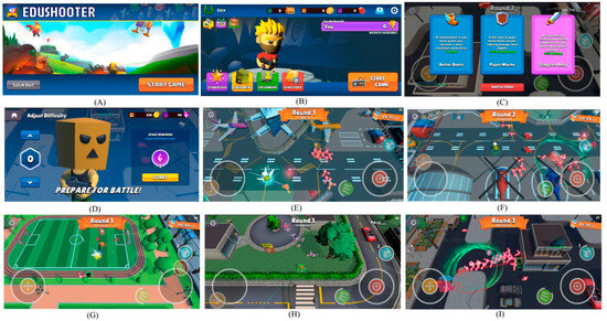 Screenshots of EduShooter: Splash Screen (A), Main Menu (B), Perk Upgrade Between Waves (C), Level Selection (D), and various gameplay screenshots (E–I).