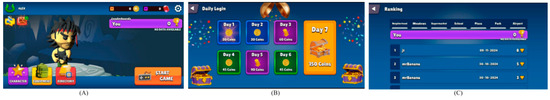 Additional Features in EduShooter: Main Menu with reward notifications (A), Daily Login Reward (B), and Leaderboard (C).