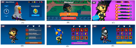 EduShooter Reward Mechanism: Level Selection (A), Coin Reward (B), Character and Weapon Upgrade (C,D), and Character Customisation (E,F).