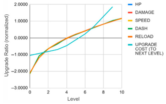 Several approaches have been proposed to develop the concept of diminishing returns in upgrading. Some games use a specific formula that follows this pattern, such as logarithmic or exponential decay functions, to model this concept. Others simply build a series of numbers based on trial and error. We use both methods to build our upgrade list, where we develop the base values using a logarithmic function and refine the list by testing the values in the game. Table 3 shows the statistical upgrade values for each level and the corresponding cost to upgrade to the next level.