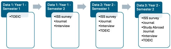 Figure 1): Data 1 was taken in their first year, second semester; Data 2 second year, first semester; and Data 3 second year, second semester post-study abroad. Data were collected from responses to the ISS and journal via an app, and a one-hour semi-structured Zoom interview, approximately three hours total. Students also provided English TOEIC test scores, part of their BA requirements.