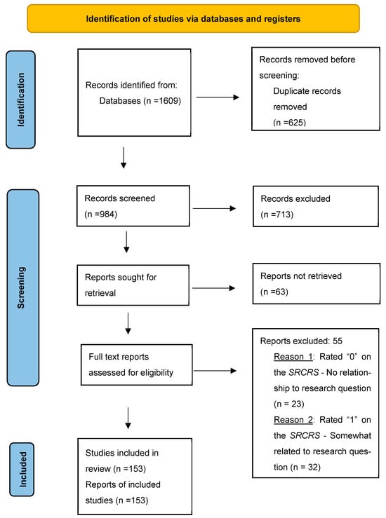 The initial search strategy was to enter all keywords to see if any literature specifically addressed the research question. When using all keywords, no articles were found in any of the databases that specifically addressed the research question. Therefore, the next step was to search using various combinations of the keywords from the six databases which identified 1609 articles. After removing duplicates (n = 625), 984 articles remained. Records were next reviewed by title and then by abstract when titles were unclear or inconclusive. This screening step eliminated 713 articles which revealed 271 articles for full-text review. Sixty-three (63) articles were then removed after an additional screening of the abstracts because they did not focus explicitly on the article’s research agenda which left 208 articles remaining for further screening. At this stage, an additional 55 papers were excluded that did not rate “2” or “3” using the SRCRS criterion particular to the education field. In the end, 153 articles remained. This process produced 153 to be included. Based on the final selection of articles, the distribution based on decade year of publication was as follows: 2020–2025 (36%), 2010–2019 (45%), 2000–2009 (14%), 1990–1999 (2%), 1980–1989 (0%), 1970–1979 (1%), 1960–1969 (1%) and n.d. (1%).