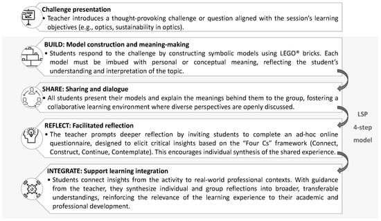 The pedagogical intervention was structured around the application of the LSP methodology to stimulate reflection and meaning-making on two core themes: (1) Optics and (2) Sustainability. The aim was to explore the integration of these themes into professional practice. The LSP process followed its fundamental sequential four-step model—build, share, reflect, and integrate—, designed to foster critical thinking, teamwork, creativity, and problem-solving (Figure 1).