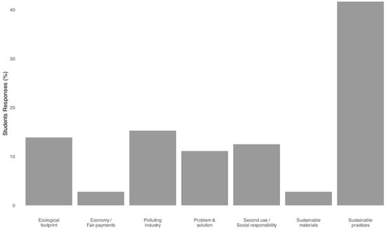 Interpretatively, these findings indicate that students are capable of integrating both environmental and social dimensions into their conceptualization of sustainability. Notably, statistical analysis showed that academic background significantly influenced students’ focus (χ2 = 15.34, df = 6, p = 0.018): those from Renewable Energies and Environment were more likely to emphasize ecological footprint (n = 10; 13.9%) and environmental impacts, while students from Optics and Optometry were more likely to focus on social responsibility (n = 9; 12.5%) and critique polluting industry (n = 11; 15.3%). This pattern suggests that disciplinary context shapes not only the content but also the ethical framing of sustainability concerns, a point echoed in previous literature about the value of interdisciplinary approaches in health education.