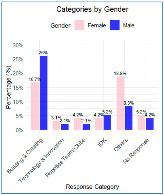 Gender patterns show that Building and Creating was reported by 24.0% of females (n = 23) and 30.2% of males (n = 29). I Don’t Know responses were given by 4.2% of females (n = 4) and 5.2% of males (n = 5). Others accounted for 24.0% of females (n = 23) and 12.5% of males (n = 12). The Other category consisted of vague or non-substantive responses such as “nothing,” “math,” “a class in middle school,” or “look at it.” Because these responses did not provide interpretable insight into students’ perspectives on engineering, they were grouped under the Other category for analysis.