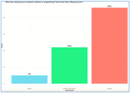 30% of the students identified external role models, including teachers, friends, parents, and other influential figures. For instance, one student shared, “My teacher inspired me to explore robotics by showing how fun and creative it can be”. Some students were influenced by family members working in engineering or related fields. One student noted, “My dad, by talking about it,” while another mentioned, “My cousin, she became an engineer and helped NASA.” However, in this population, the absence of role models is reported by 63% of the students, which is twice as many as the 30% of students who reported having a role model. A small group of students (7%) cited themselves as their own inspiration, reflecting a self-driven interest in robotics and engineering. One such student remarked, “I inspired myself to explore engineering.”